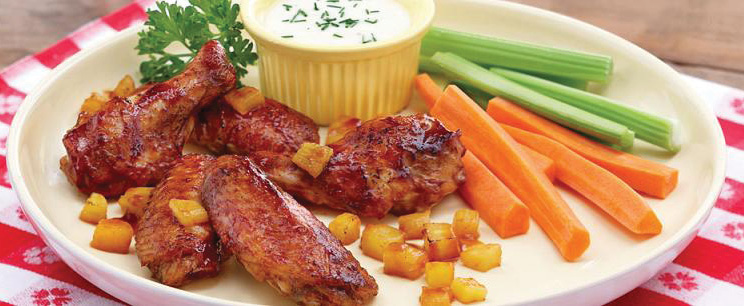 4. Хэрчсэн лаазтай ханборгоцойг шүүстэй нь мөн кетчуп, бор элсэн чихэр, шар буурцагны цуу зэргийг холиод нэг саванд хийнэ. Сүмснээс халбаганы талаар авч далавчин дээр дусаагаад тахианы далавчийг үргэлжлүүлэн 10-15 минут жигнэнэ. Далавчийг эргүүлээд дахин сүмсээ дусааж 10-15 минут жигнээд бүрэн болсон эсэхийг шалгаад гаргана. Халуунаар нь ширээнд өгнө.